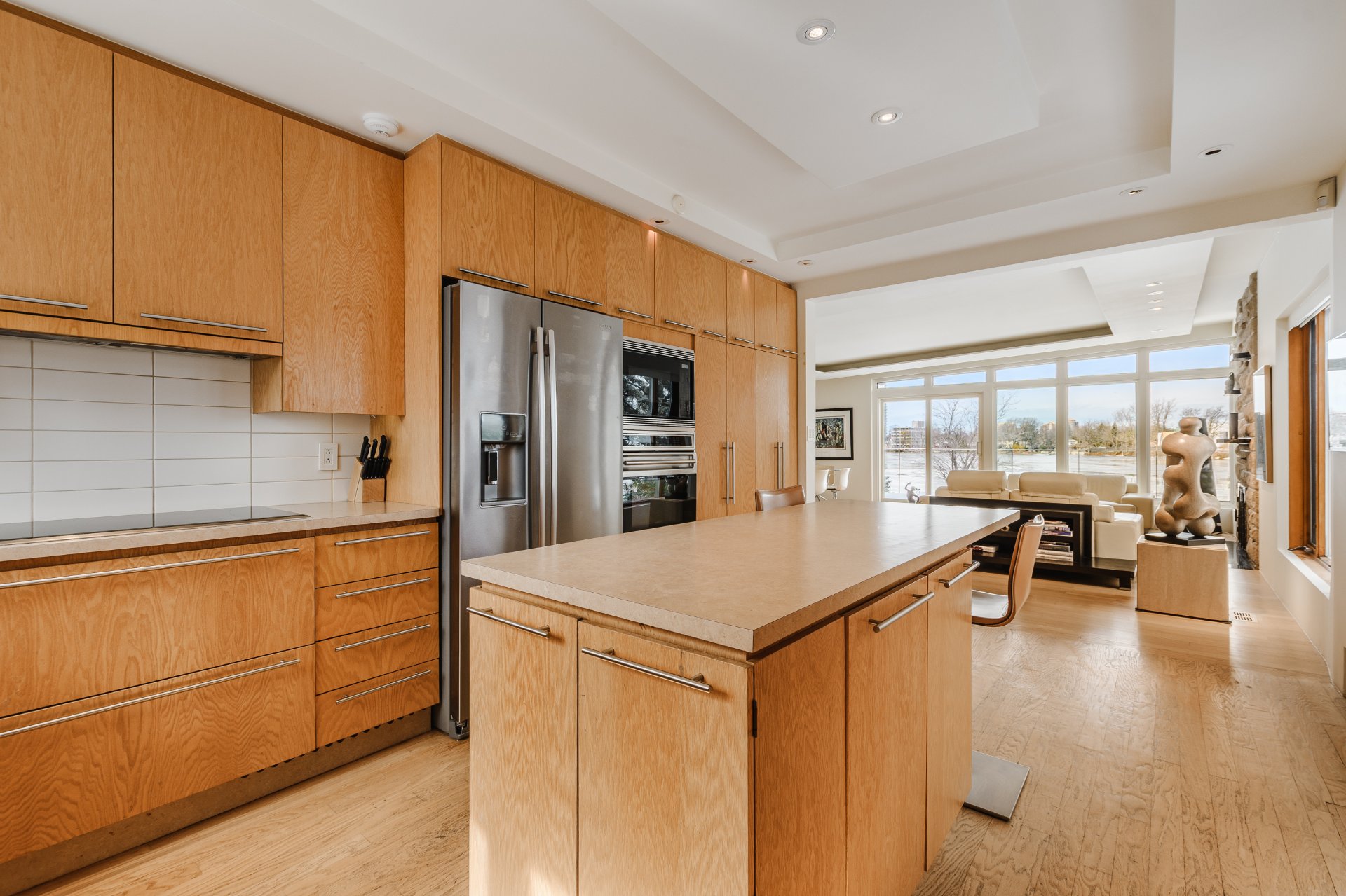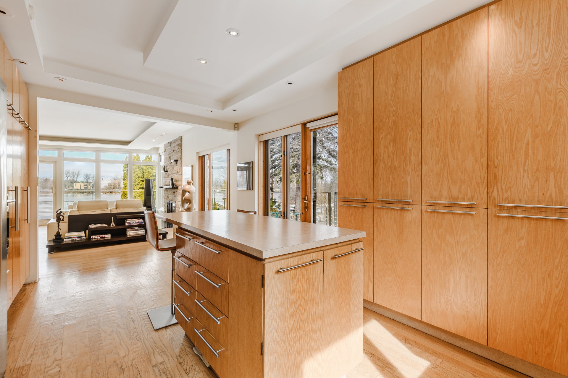 The kitchen, both functional and discreet, stands out with integrated appliances, custom cabinetry, and a central island that structures daily living. The adjacent dining areas open onto terraces overlooking the water, naturally extending the indoor experience outdoors.