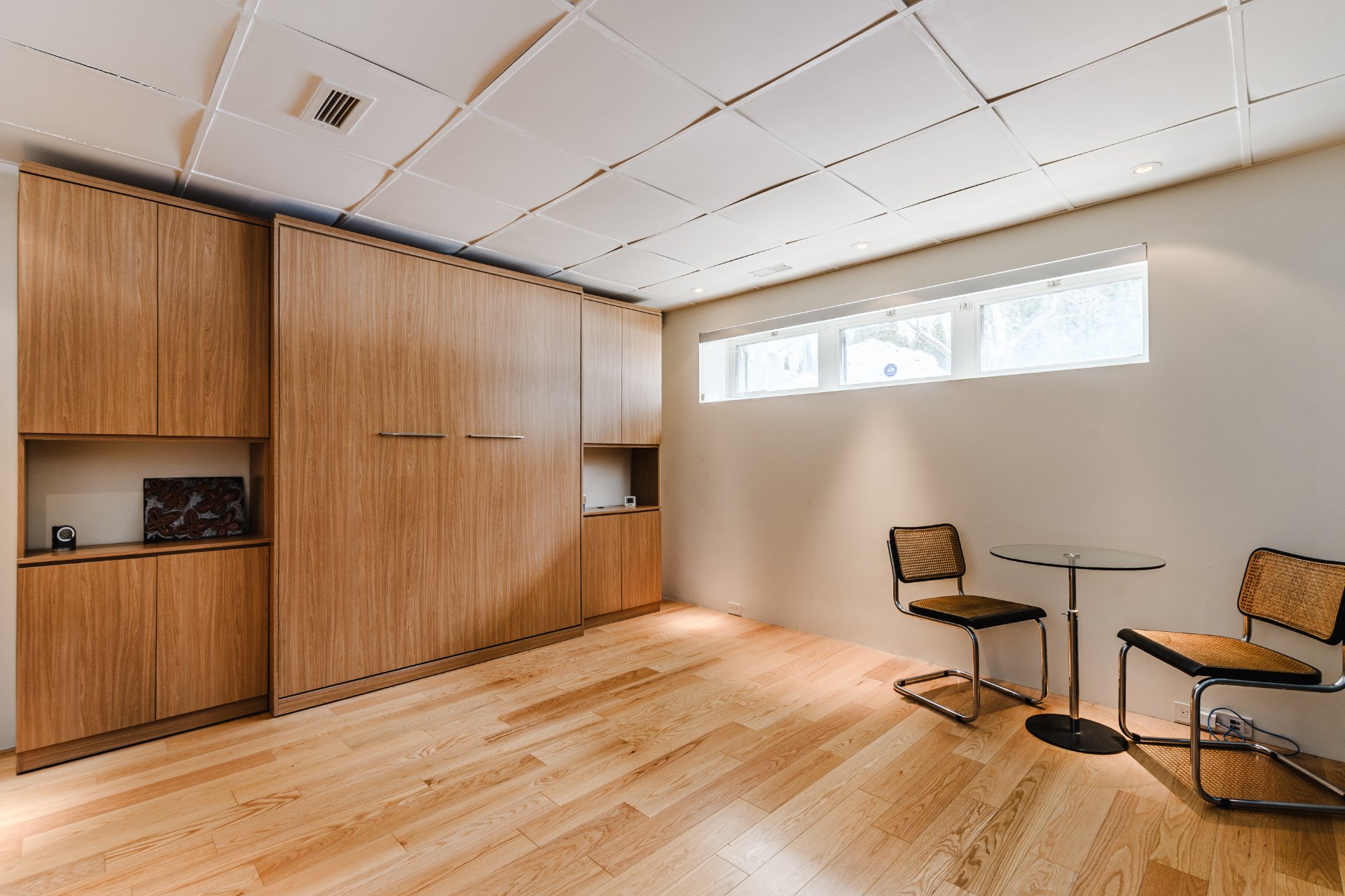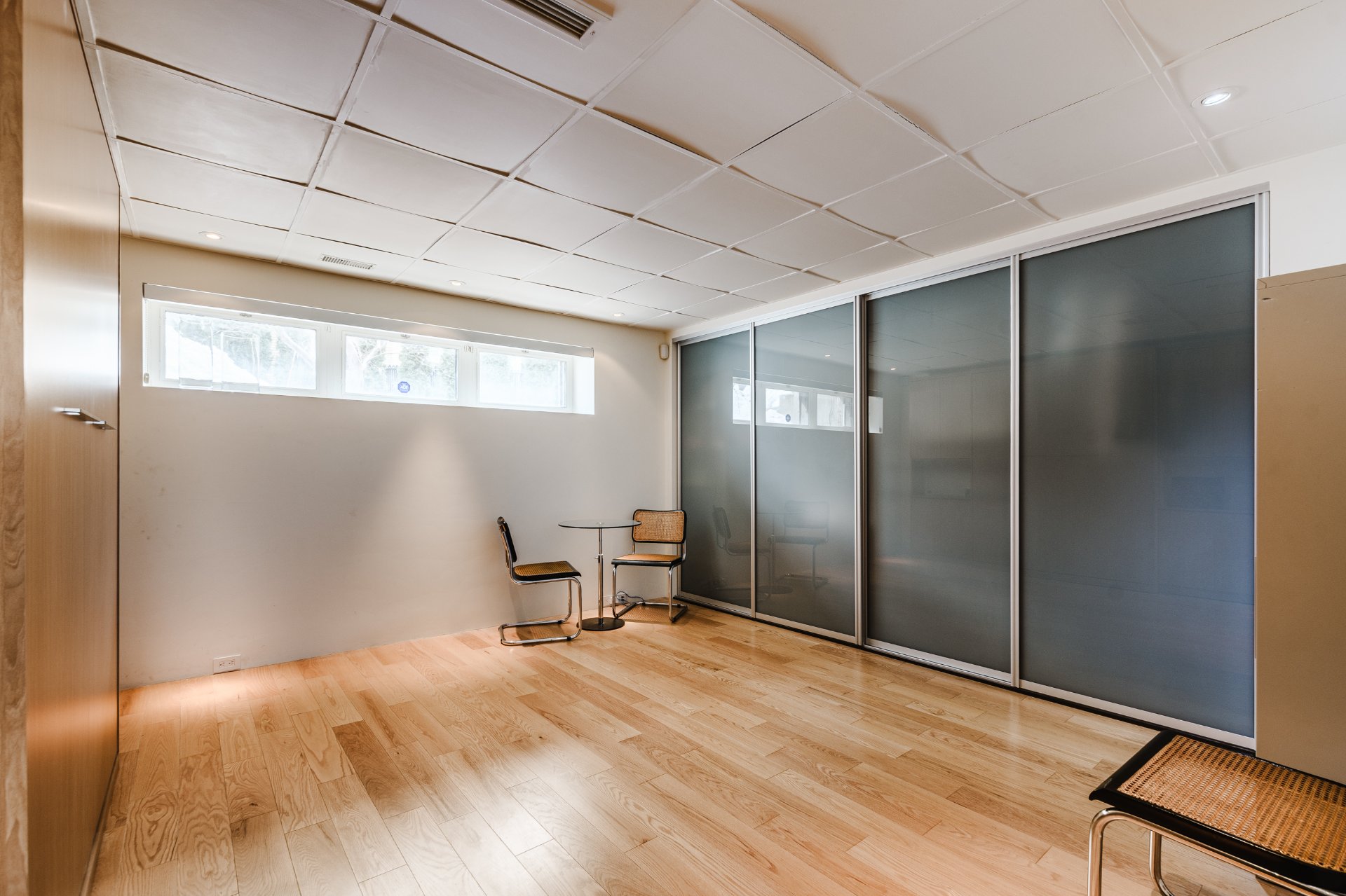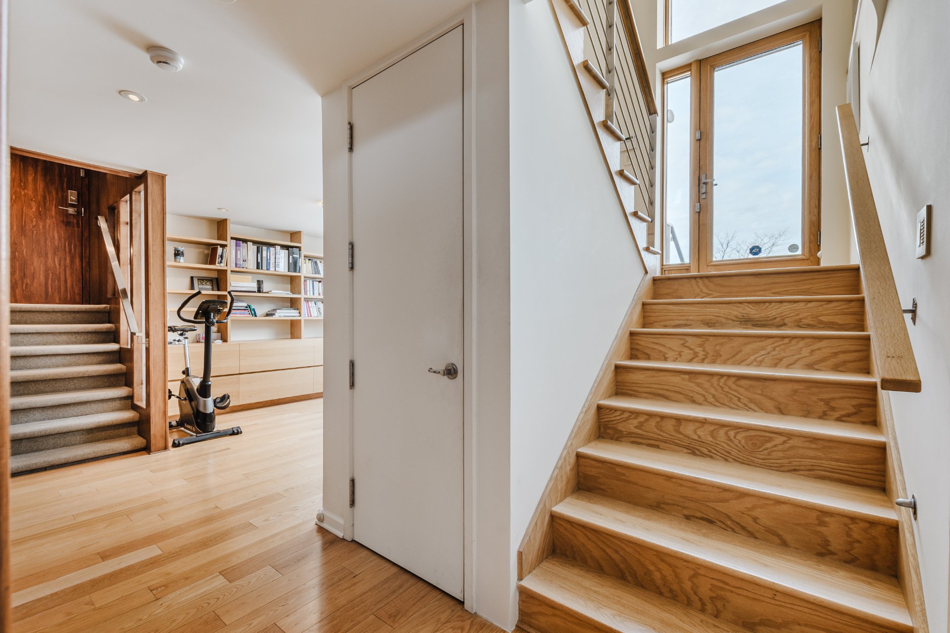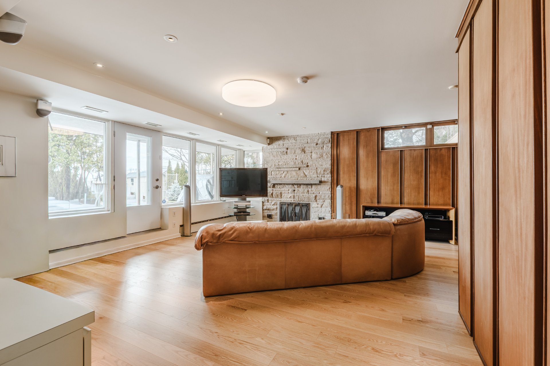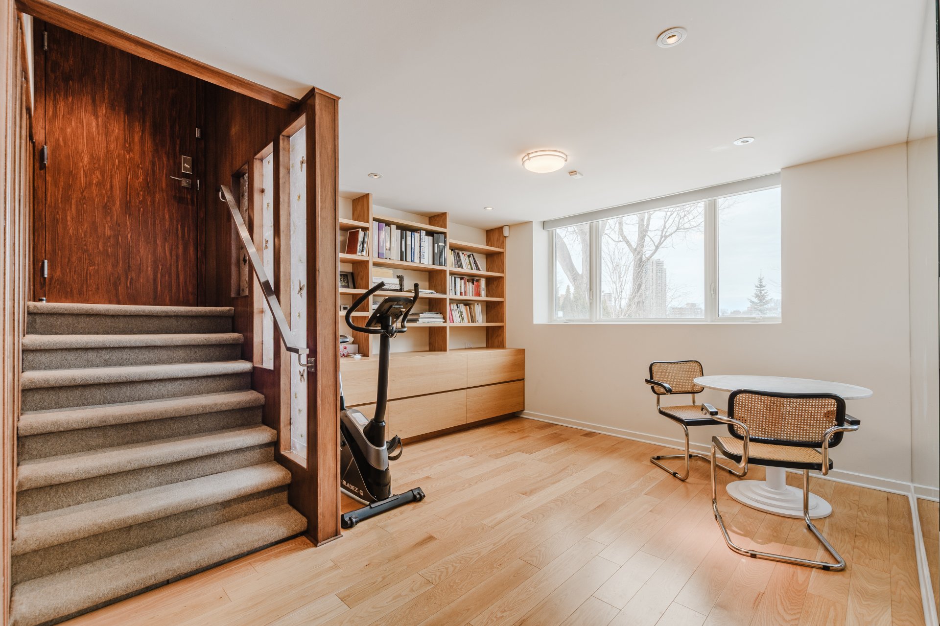 The lower level enhances the property's versatility with a warm family room featuring a stone fireplace. A gym or office space, integrated storage areas, and an additional bedroom comfortably accommodate family and guests. The basement also includes an independent ground-level walk-out, adding remarkable functionality and flexibility to the space.